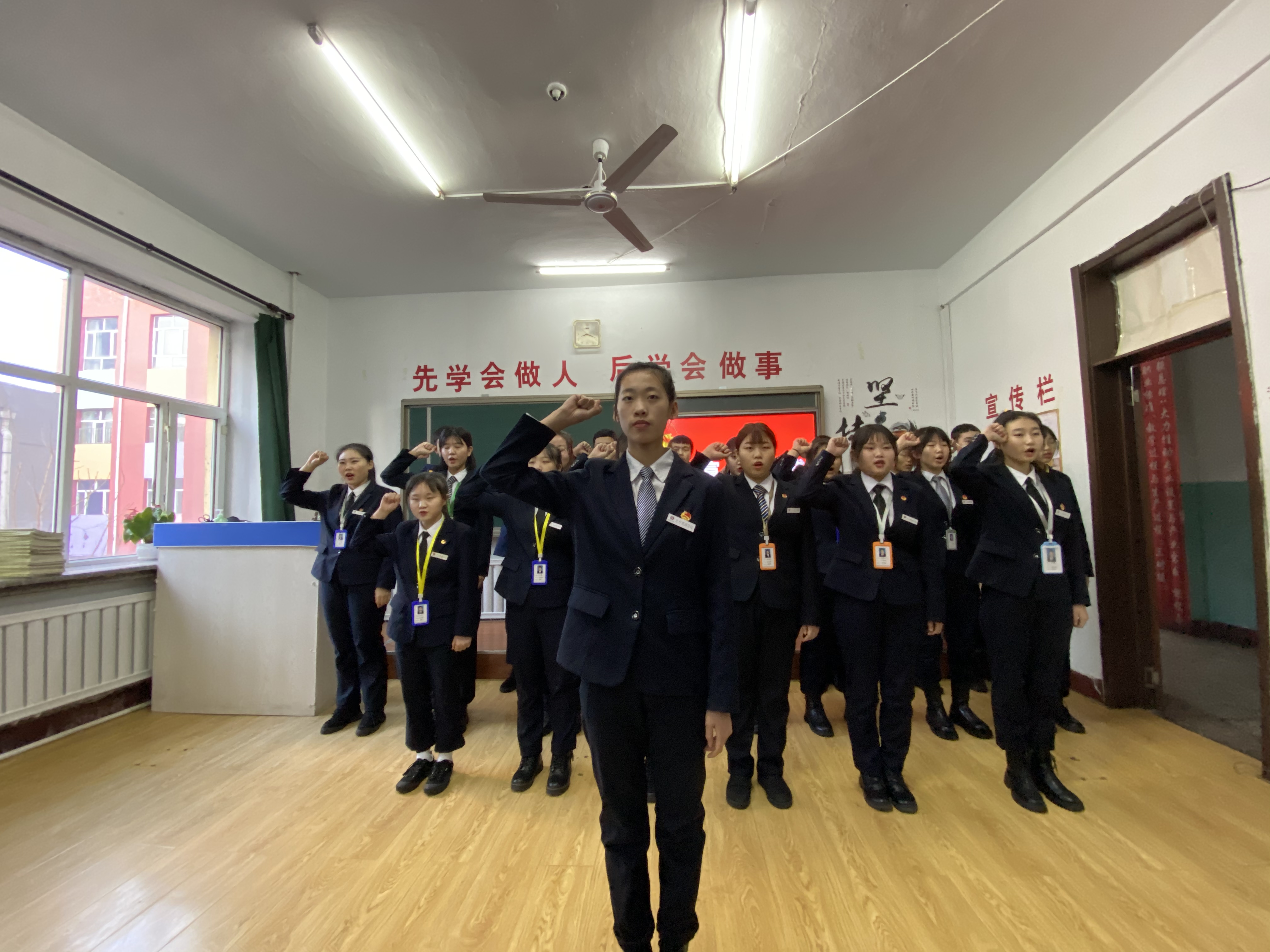 入团仪式中新团员意气风发在老团员为其佩戴团徽后表示“积极响应国家的号召,完成团组织的任务;遵纪守法,遵守学校各项规章制度;勇于创新做出成绩,积极开展批评和自我批评;在共青团的带领下努力拼搏、为团争光。”