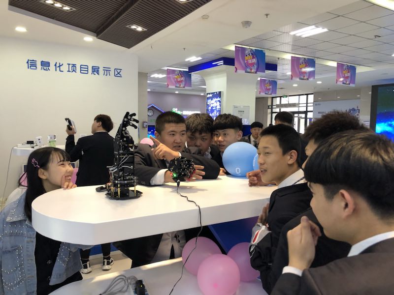 同学们进入大厅后 ,有专门的讲解员讲解5G网络的由来和产生,其次还参观了中国移动信息化展区,分为四个功能区,包括能力展示区,信息化产品展示区,万物互联展示区,信息化项目展示区。