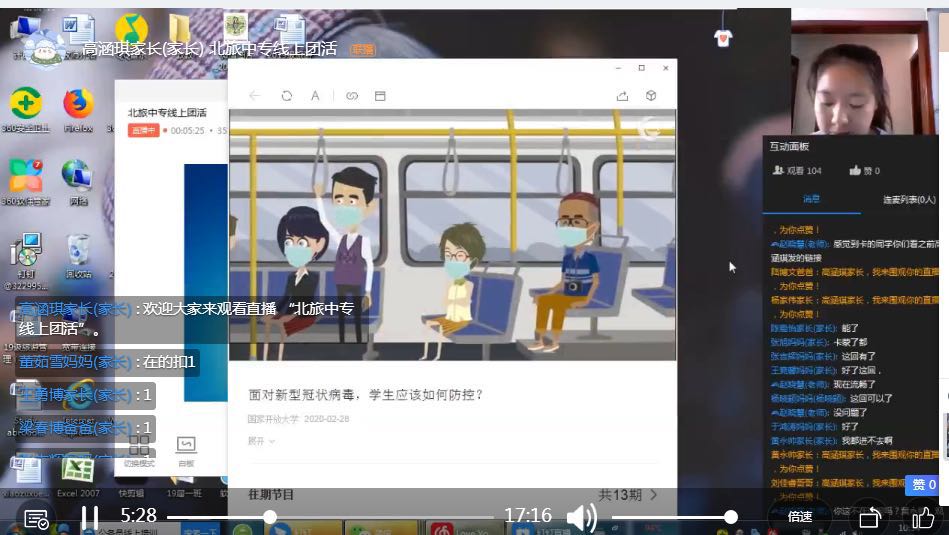 在本次团活中,高涵琪同学提前发放了视频中提到的疫情防护要点和知识,随后带领同学们观看了由学习强国app提供的视频:“面对新型冠状病毒,学生将如何防控?”。在观看视频后采取与同学们连麦、公示板互动等方式进行提问,加深同学们观看视频后的印象,切实做到重视、正视疫情、人人学会防护。