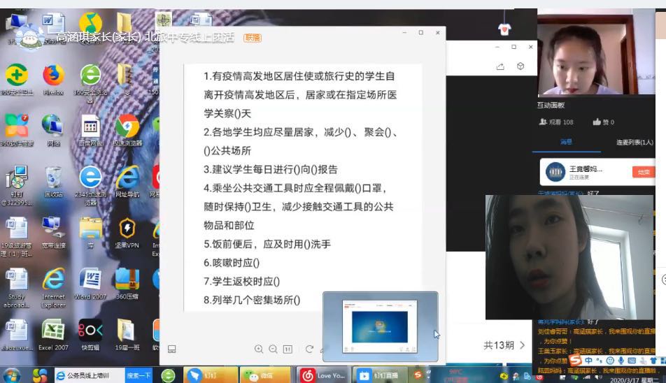 为了更好的贯彻落实上级教育部门下达的文件及指示精神,加强学生对新冠病毒的重视及在疫情期间自身防护措施,我校于3月17日上午10;30再次开展了全校性质的主题团活,此次团活由校团委成员高涵琪同学通过钉钉群以多群联播的形式进行。