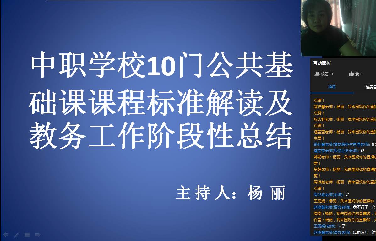 于4月10日下午15:30分,我校相关教学骨干教师在钉钉直播平台进行线上教学研讨会,会议分为两项议程,一是“中职学校10门公共基础课课程标准解读”;二是“教务工作阶段性总结”。