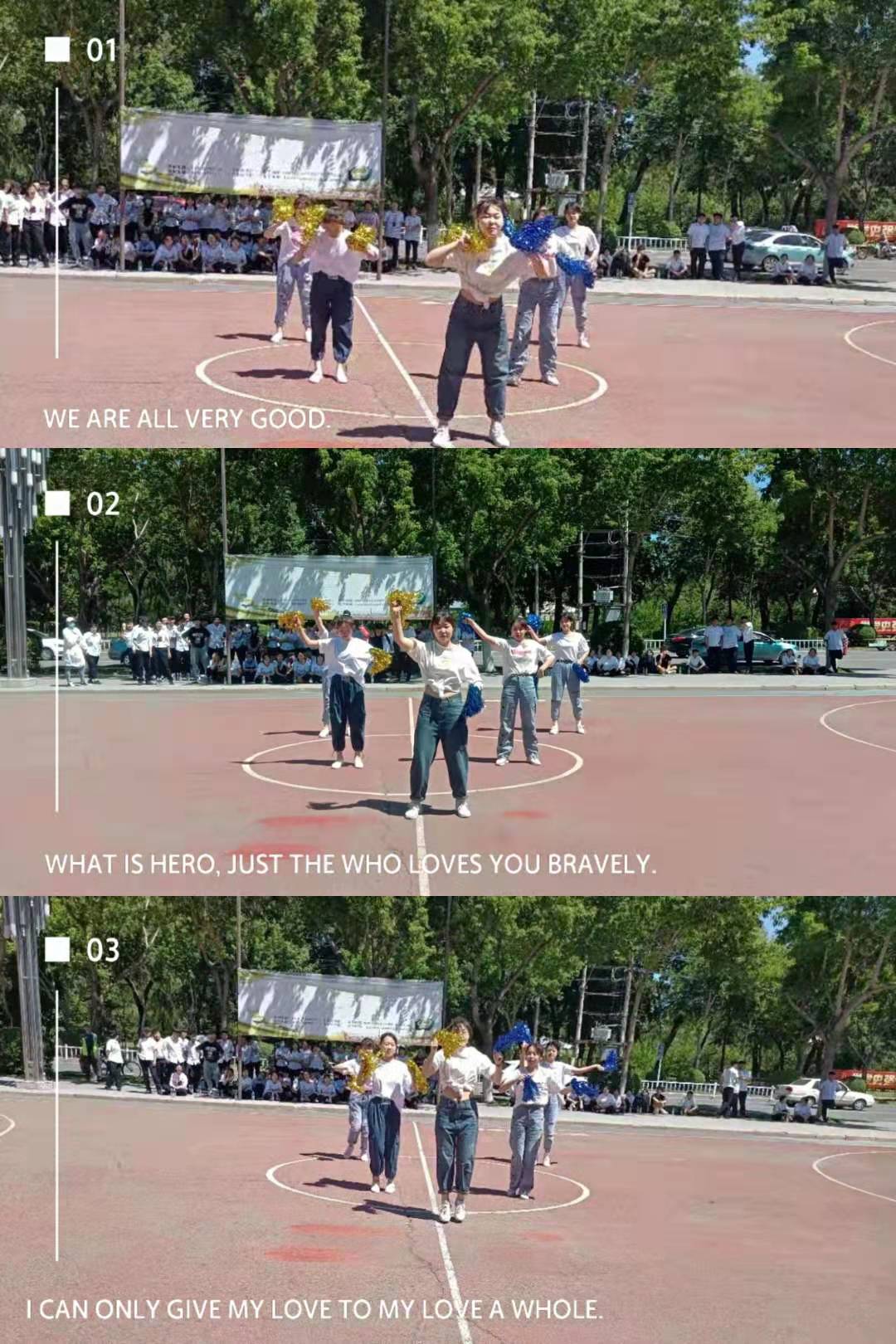 在短暂的调整之后,我校啦啦队的同学们伴随着轻快优美的旋律登场,如精灵般旋转跳跃,绽放阳光般灿烂明媚笑容,她们用飞扬的秀发、青春的激情和灵动的舞步形成运动会赛场上一道阳光亮丽的风景线。 随着演出的结束,一声哨响,下半场比赛开始了,我们又被拉回了紧张的篮球赛当中。你快攻,我抢断,你突破,我上篮,比分交替上升,也随之将比赛推向高潮。