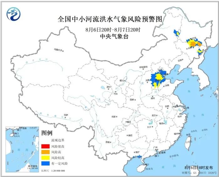 6日18时,中央气象台发布中小河流洪水气象风险预警:预计6日20时至8月7日20时,河北中西部、北京西南部、内蒙古东部、吉林中北部和东部、黑龙江西部和南部等地的部分地区发生中小河流洪水的气象风险较高(黄色预警),其中,吉林中北部、黑龙江南部等地局地发生中小河流洪水的气象风险高(橙色预警)。