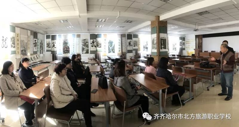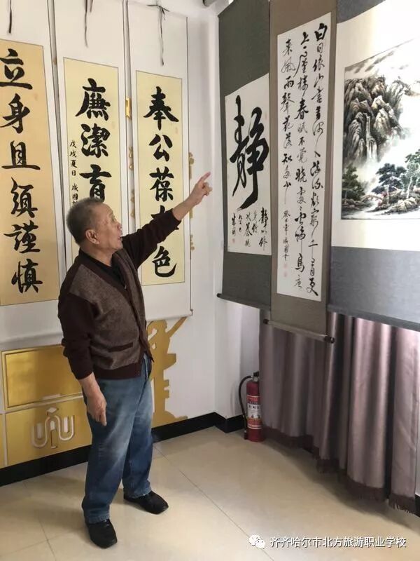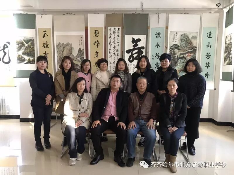 我校教师观展过程中有幸得于老先生对作品的逐一讲解如:各种字体的用笔、我国书法的主要流派、书画悬挂位置的讲究;以及各幅作品创作历程,使教师们对书画艺术有了更进一步的认识。